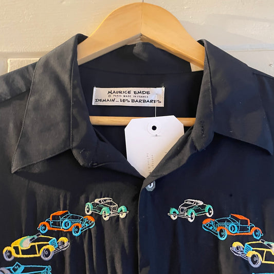 1970s Navy Patterned Dagger Collar Button Up Shirt