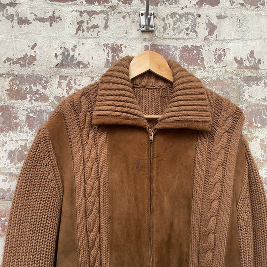 Vintage 1970s 1980s Brown Suede Leather Knitted Cardigan Jumper