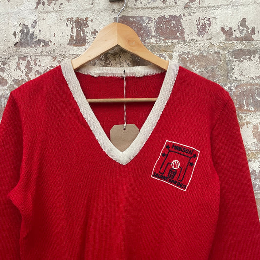 Vintage 1970s 1980s Red Knitted V-Neck Graphic Jumper