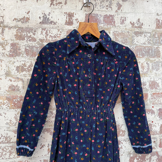 1970s Navy Corduroy Printed Dress