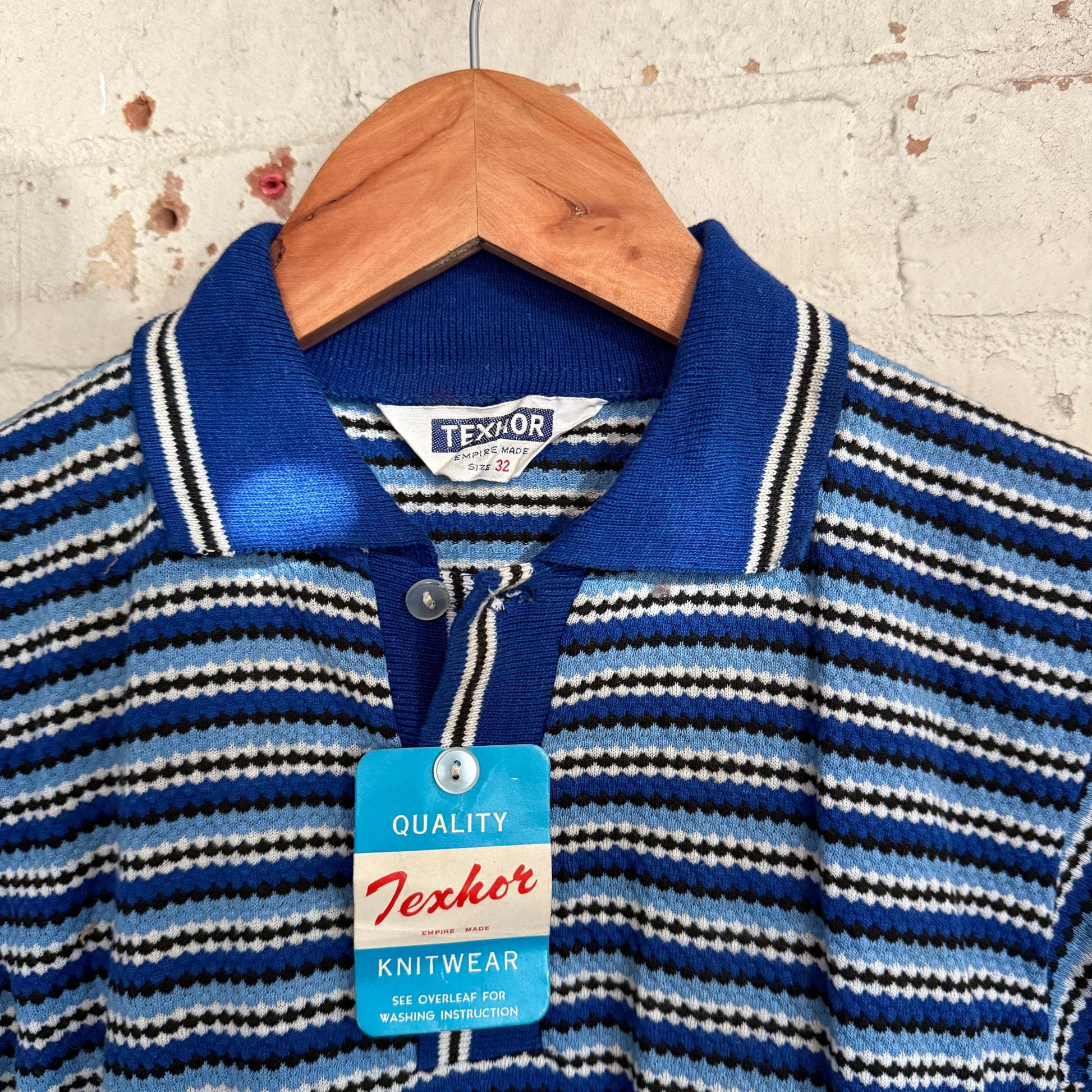 1960s 1970s Blue Patterned Dead Stock Polo Shirt Top