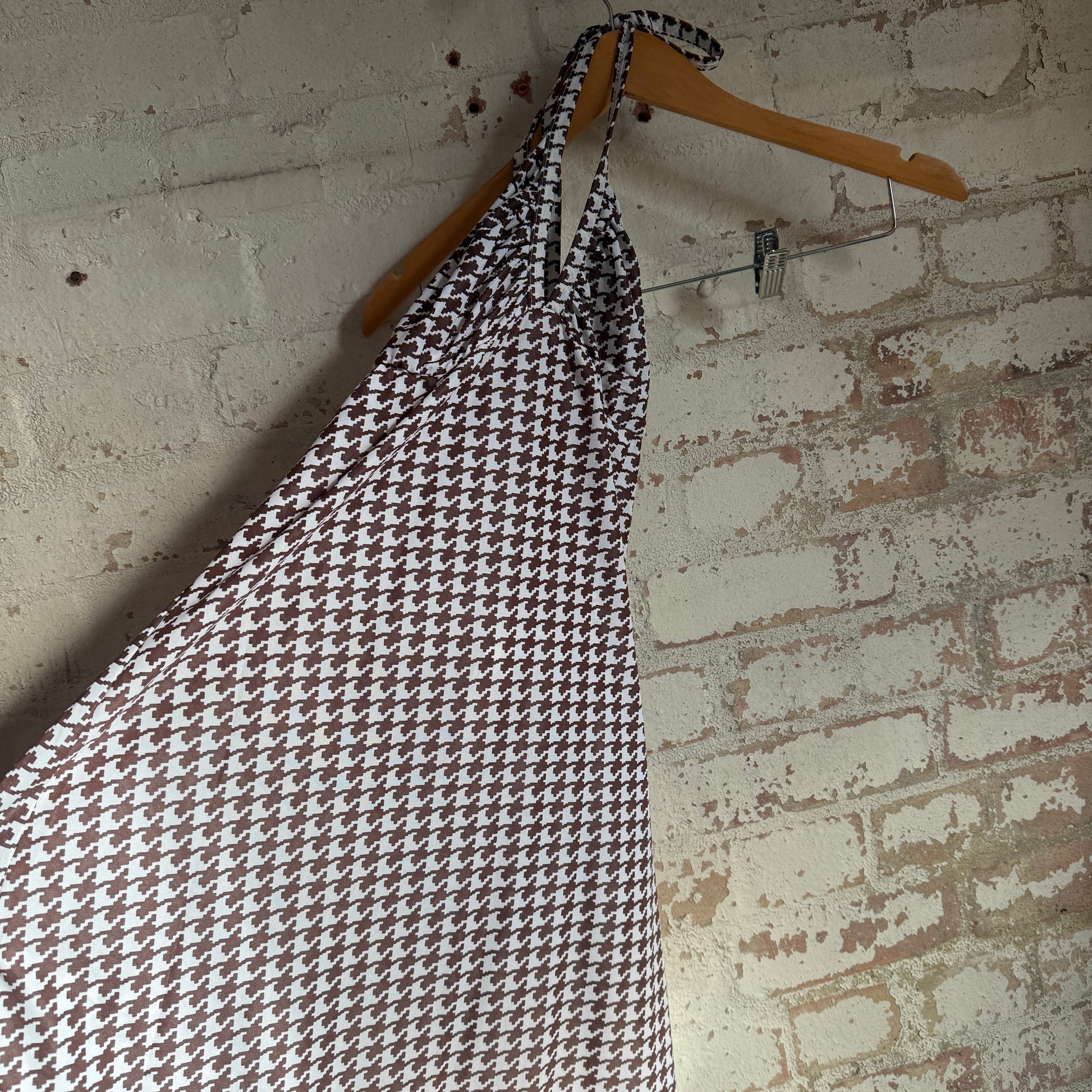1970s Brown Houndstooth Checkered Halter Neck Dress
