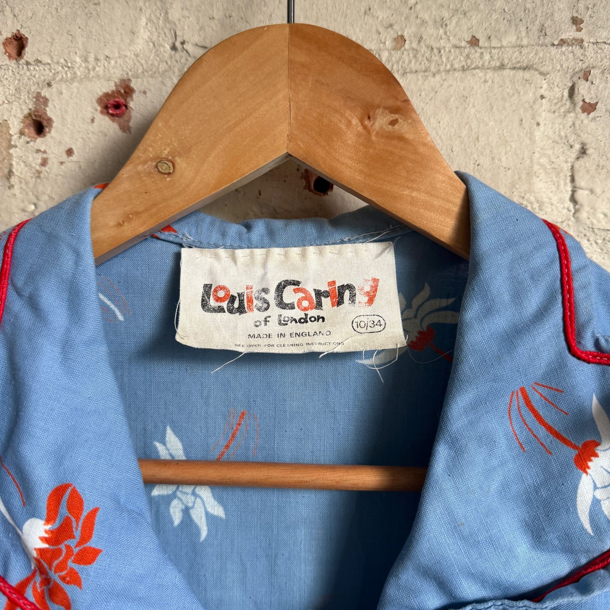 1970s Blue Louis Caring Red Floral Print Cotton Dress