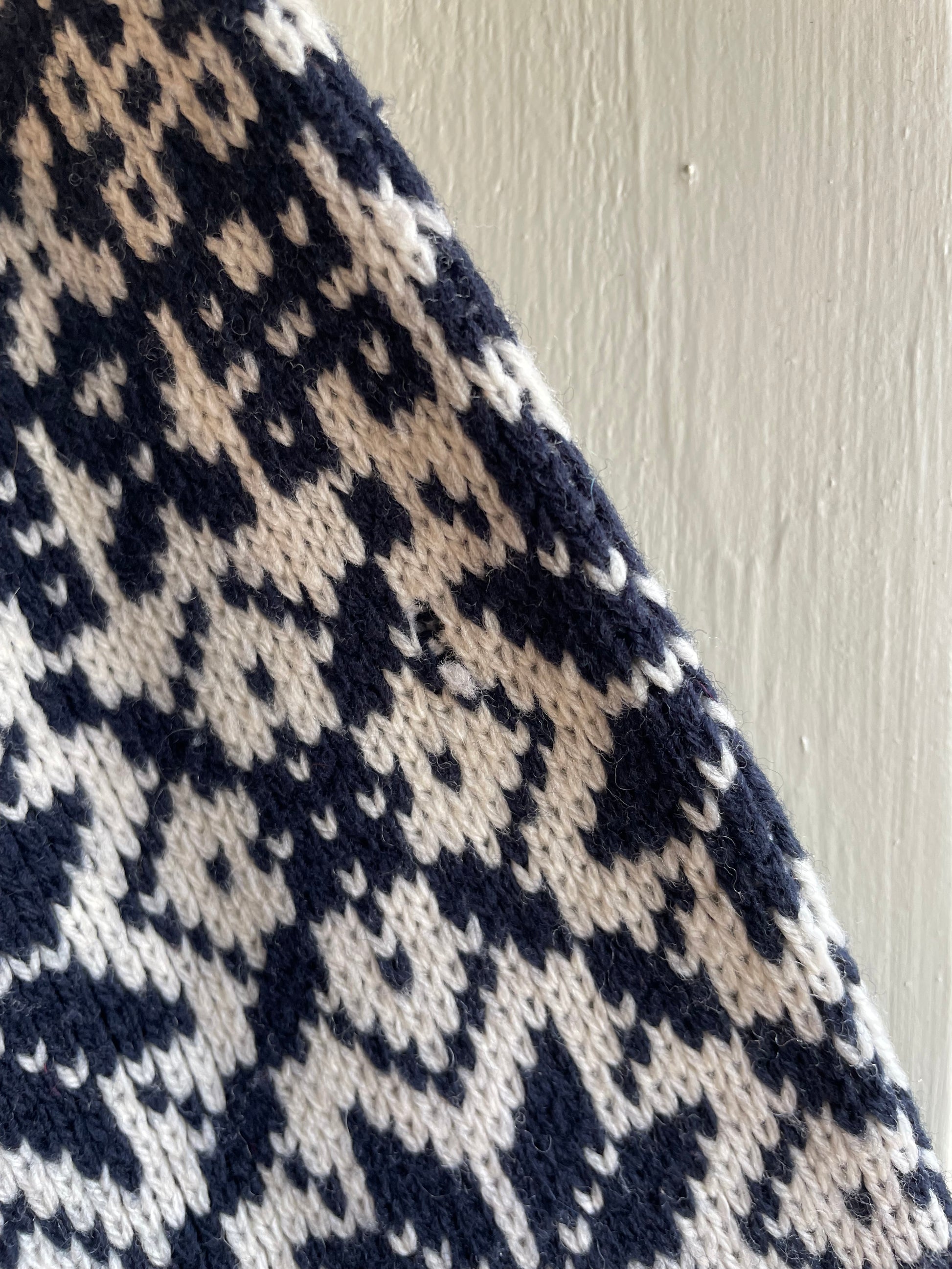 Good condition - faint red stain on right sleeve, small hole on back of left arm as seen in photos.