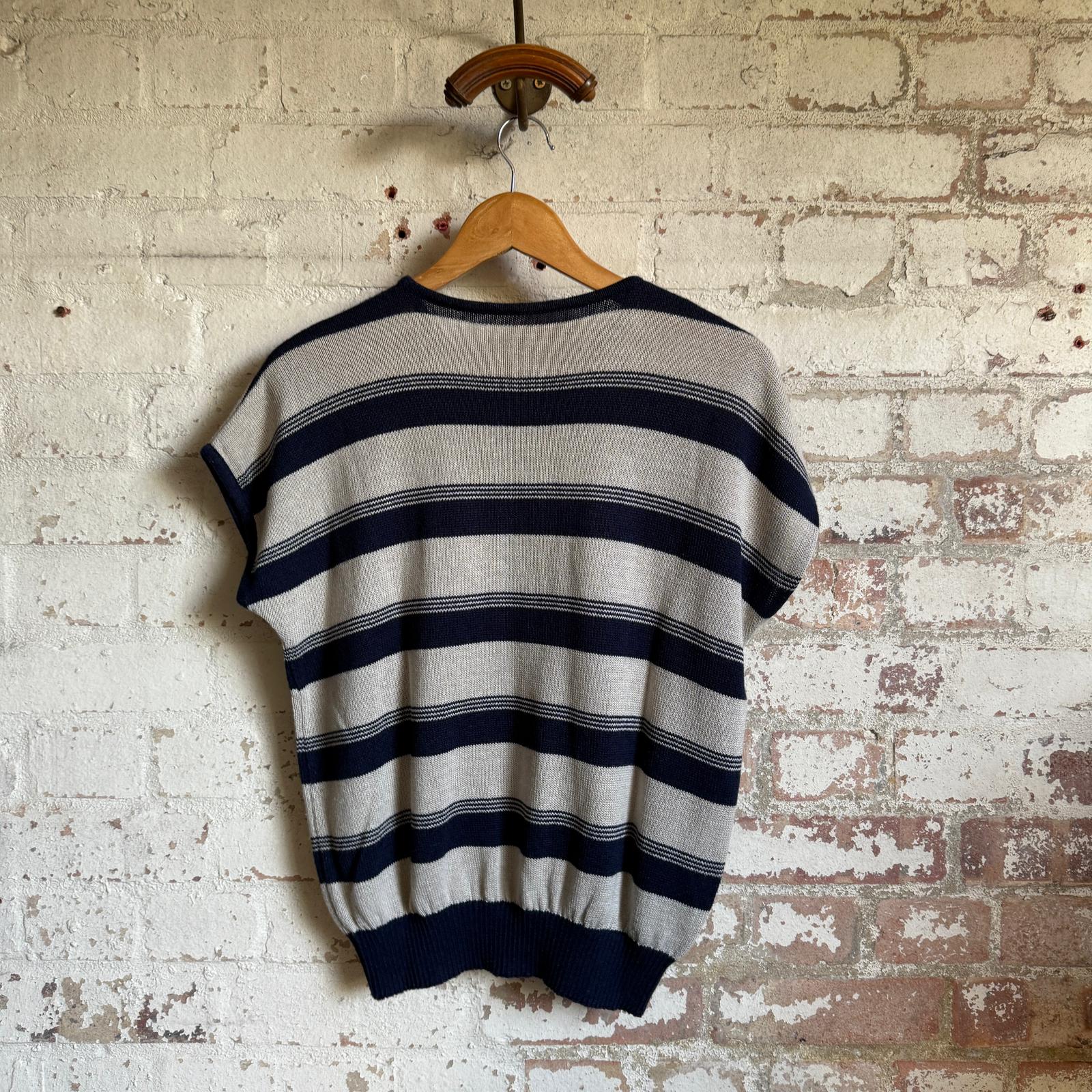 1980s Grey and Navy Knitted Stripe Jumper Top